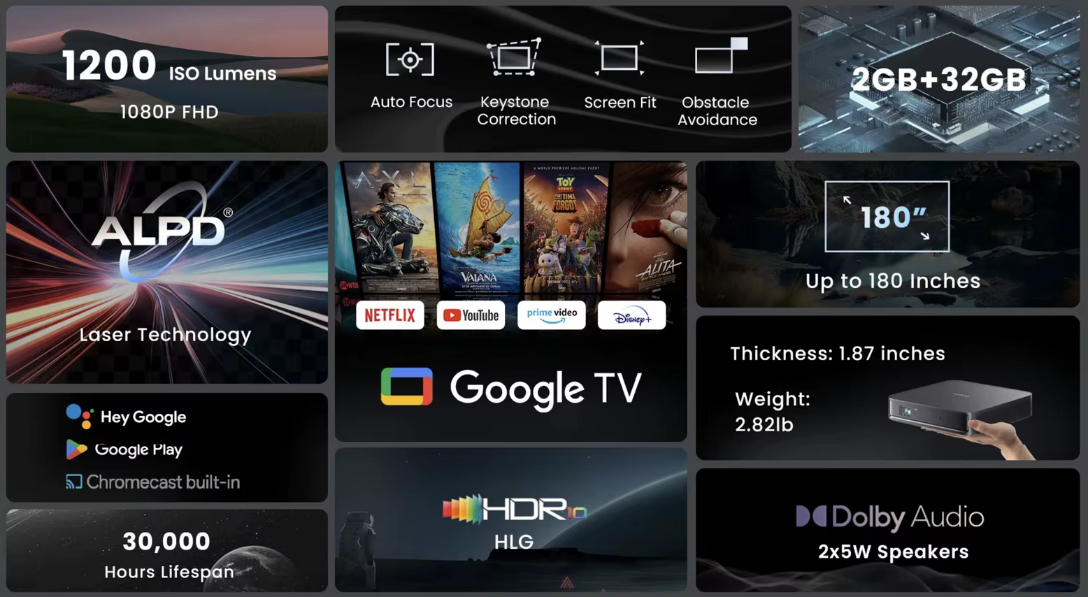 Integrated with Google TV, this smart projector offers seamless access to streaming platforms like Netflix, YouTube, and more, all navigable through an intuitive interface and voice-controlled Google Assistant. The compact, lightweight design (1.27kg) makes it easy to move between rooms or take on the go, while features like auto-focus, auto-keystone correction, and low-latency gaming mode ensure effortless setup and versatile use. Dual high-fidelity speakers with Dolby Audio support deliver rich, immersive sound to complement the stunning visuals. With WiFi 6, HDMI 2.1, and USB connectivity, the projectior is a versatile, future-proof solution for a premium home theater experience.